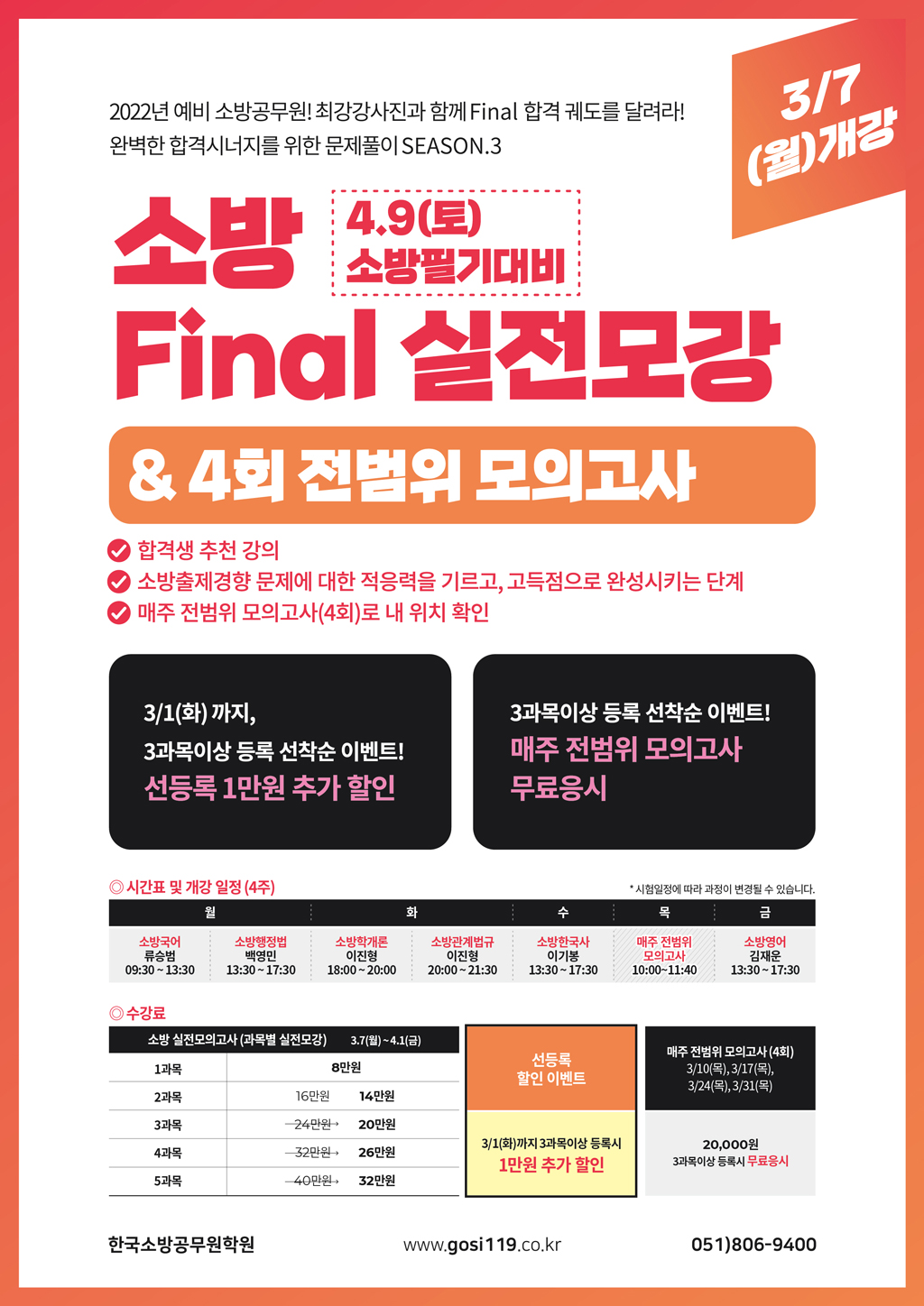 4.9 소방직대비! 최강 강사진과 함께 Final 합격 궤도를 달려라!완벽한 합격시너지를 위한 문제풀이 SEASON.3소방 Final실전모강 & 매주4회 연속모의고사3월 7일 월요일 개강! (국어 2/28(월)개강)
