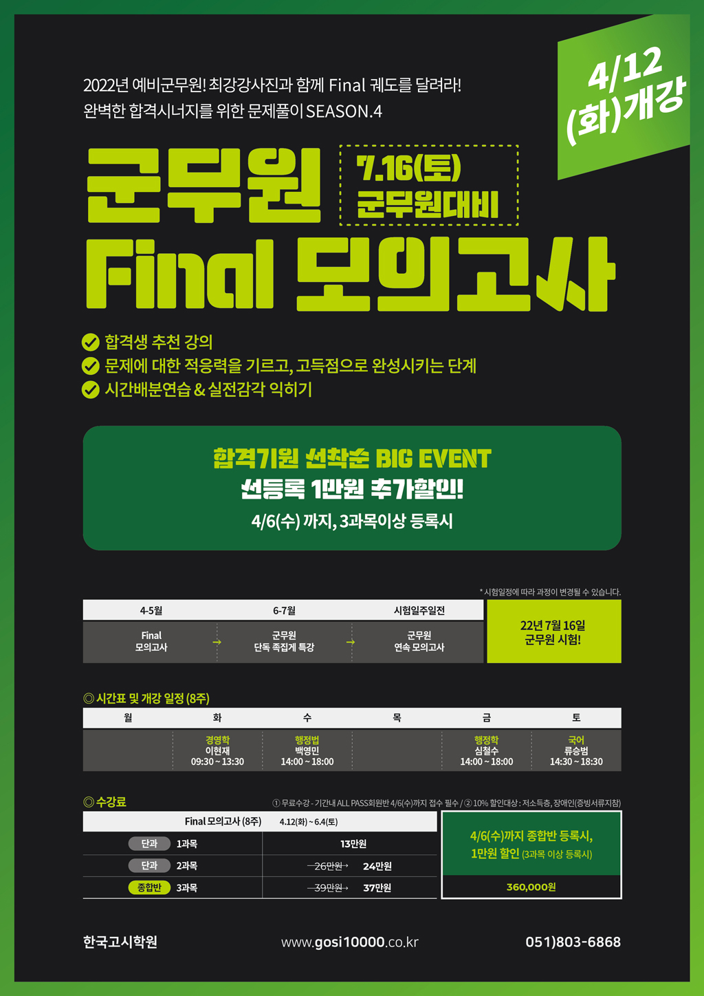 "합격생추천강의" 최강 강사진과 함께 Final 합격 궤도를 달려라!완벽한 합격시너지를 위한 문제풀이 SEASON.4Final모의고사 4월 12일 화요일 개강!** 경영학은 기출+예상문제풀이수업으로 진행됩니다 **▶ 군무원 final 모의고사 수강신청하러가기 ◀