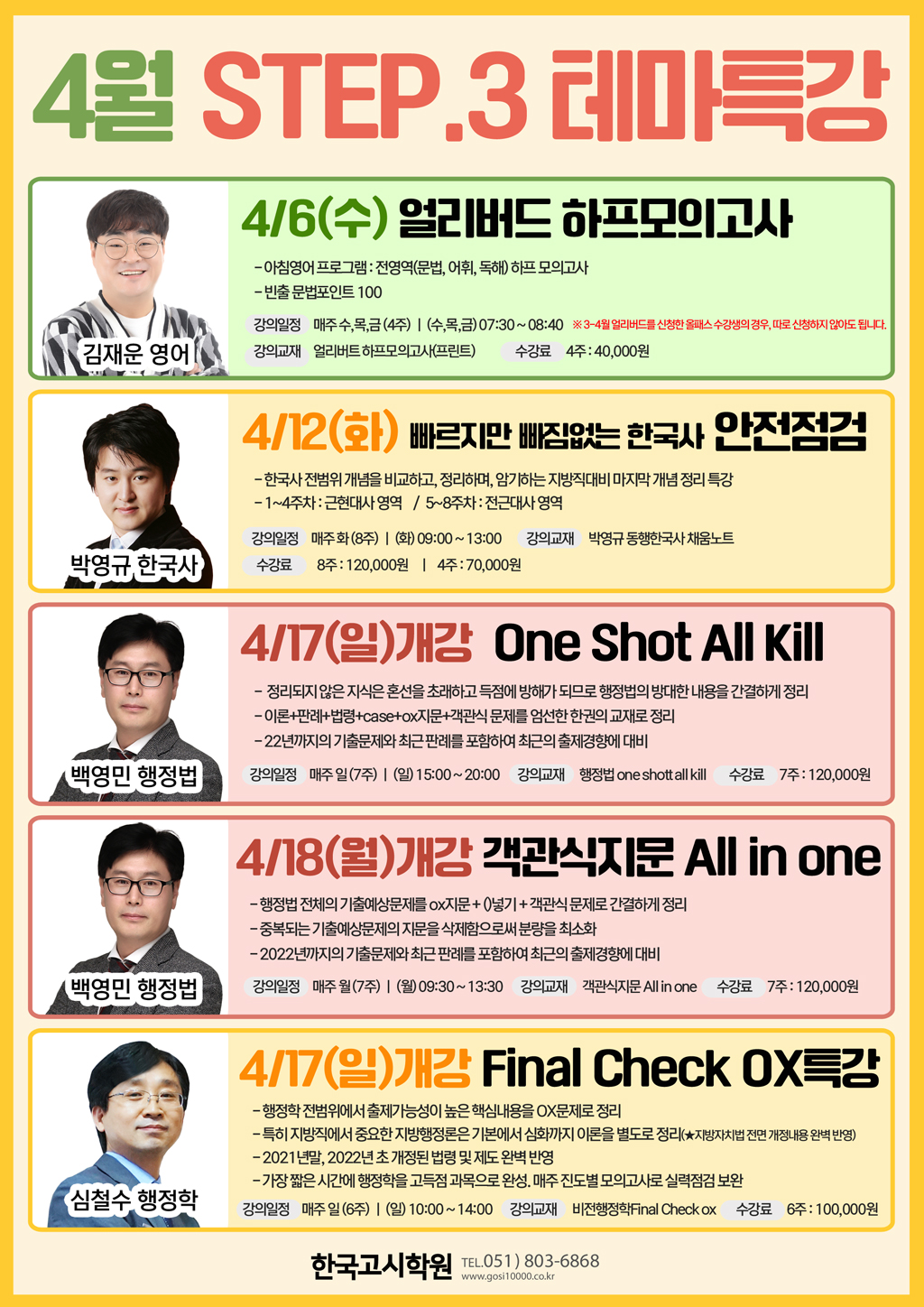 [4월] ◆ 영어,한국사,행정법,행정학 STEP.3 테마특강 4/6(수) 개강!◆