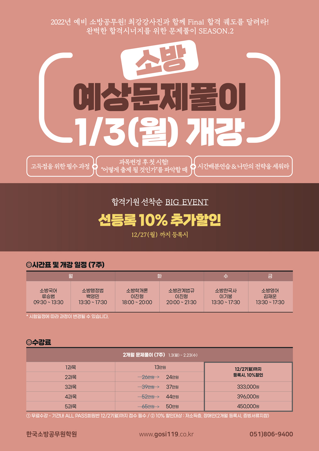 2022년 예비소방공무원! 최강 강사진과 함께 Final 합격 궤도를 달려라!완벽한 합격시너지를 위한 소방단독 문제풀이 SEASON.2소방단독 예상문제풀이 1월 3일 월요일 개강!