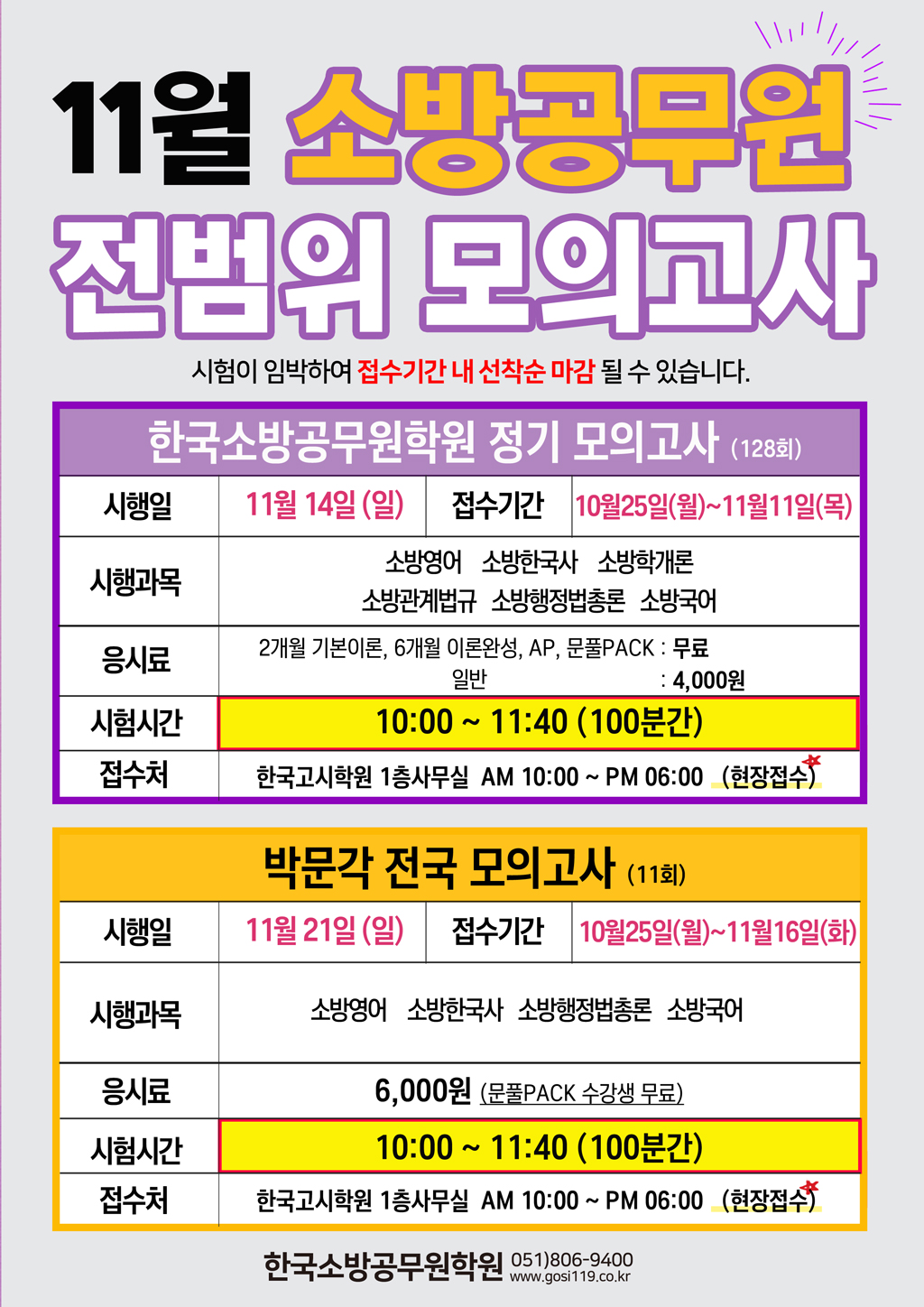 [11월] 한국소방공무원학원 정기 모의고사 & 박문각 전국 모의고사 시행
