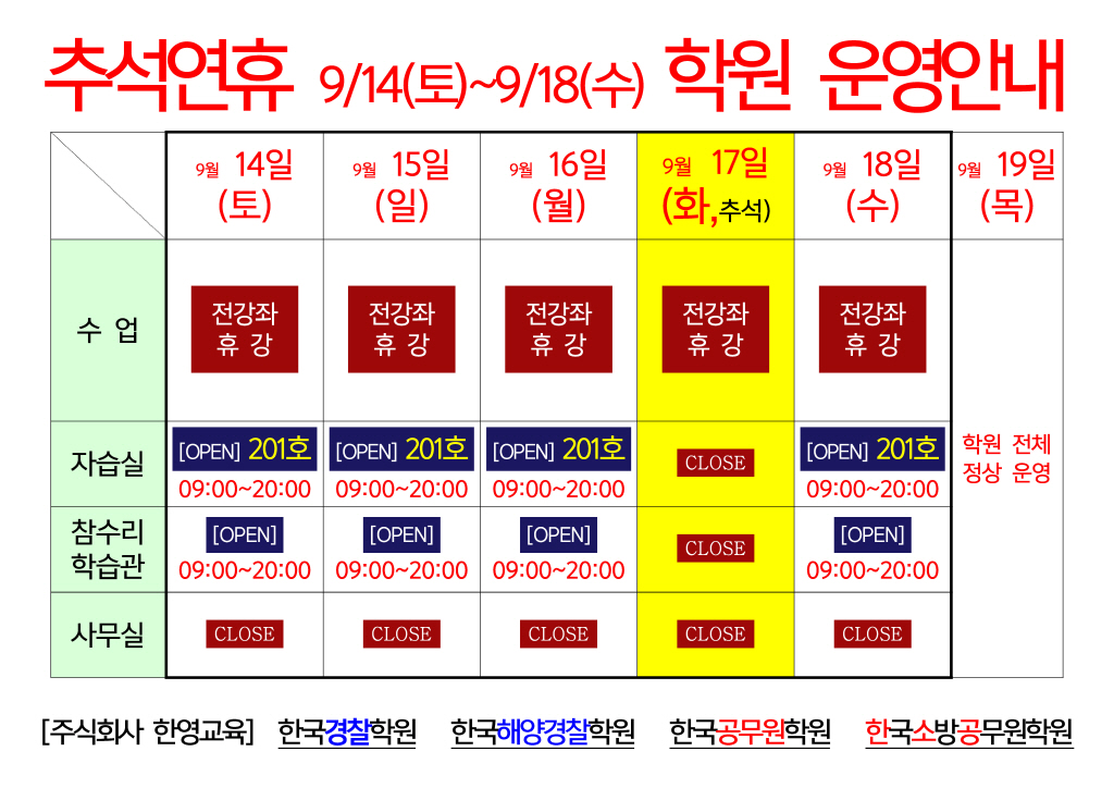 추석연휴 학원운영 안내