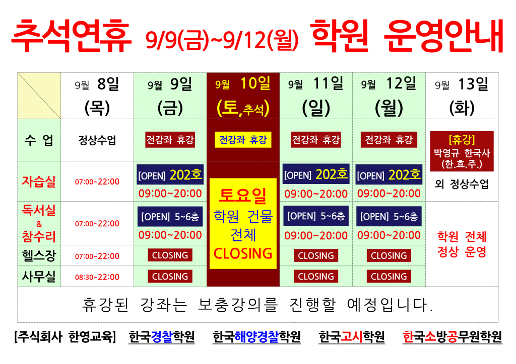 ※ [추석연휴] 학원 운영 일정 안내 (강의, 자습실, 정독실 등)