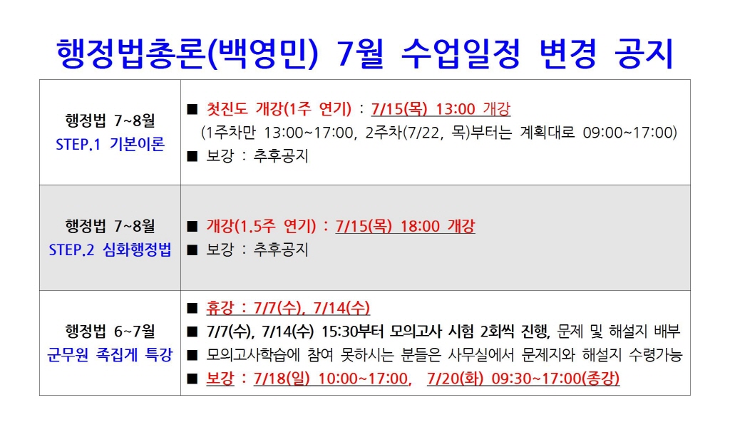안녕하세요. 한국고시학원입니다. 7월 행정법(백영민) 수업일정이 변경되어 안내드립니다.