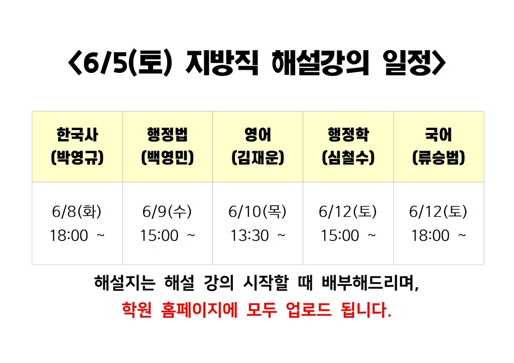 ● 6/5(토)시행 지방직 공무원 기출문제 해설강의 일정안내 ●