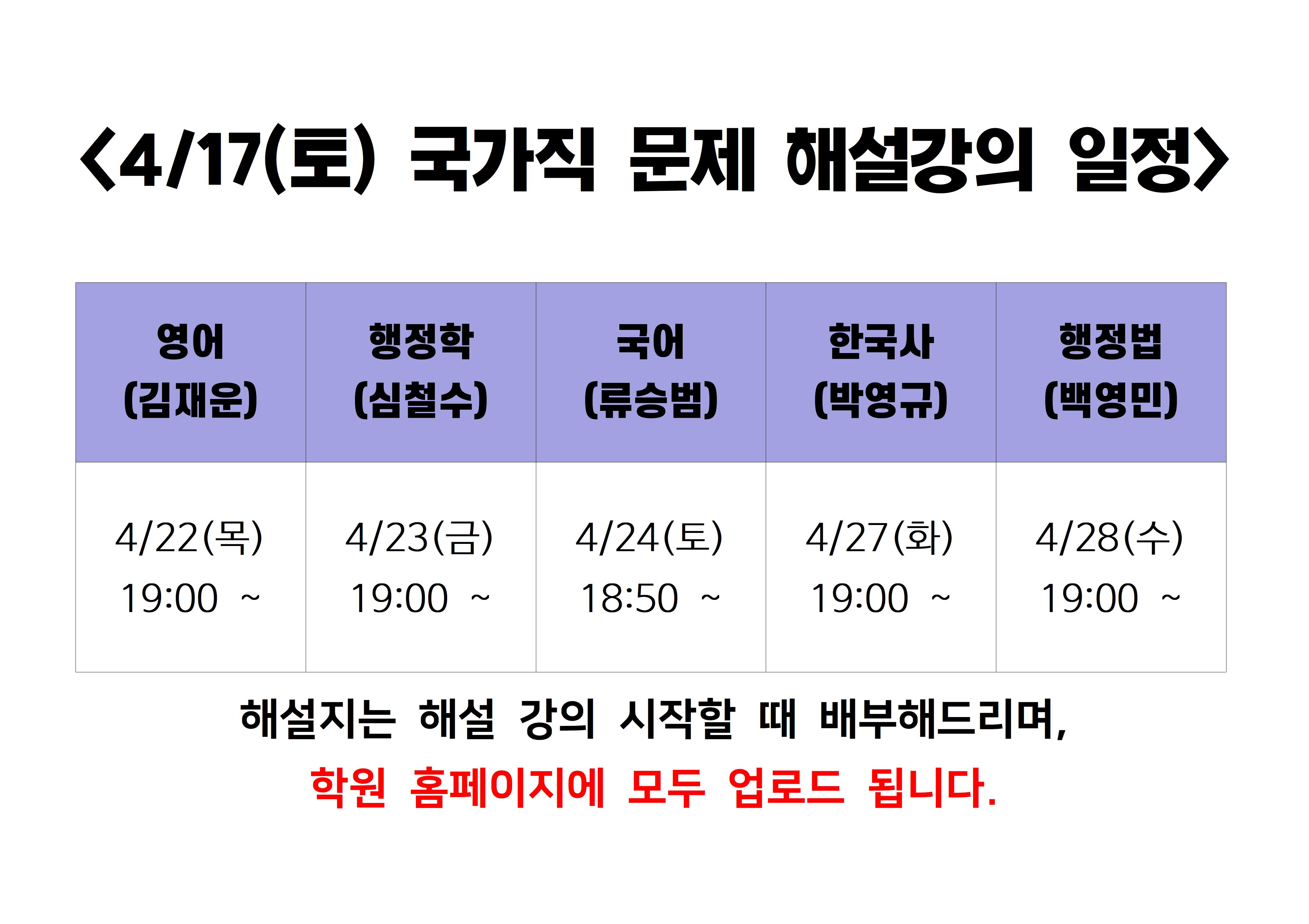 ● 4/17(토)시행 국가직 공무원 기출문제 해설강의 일정안내 ●