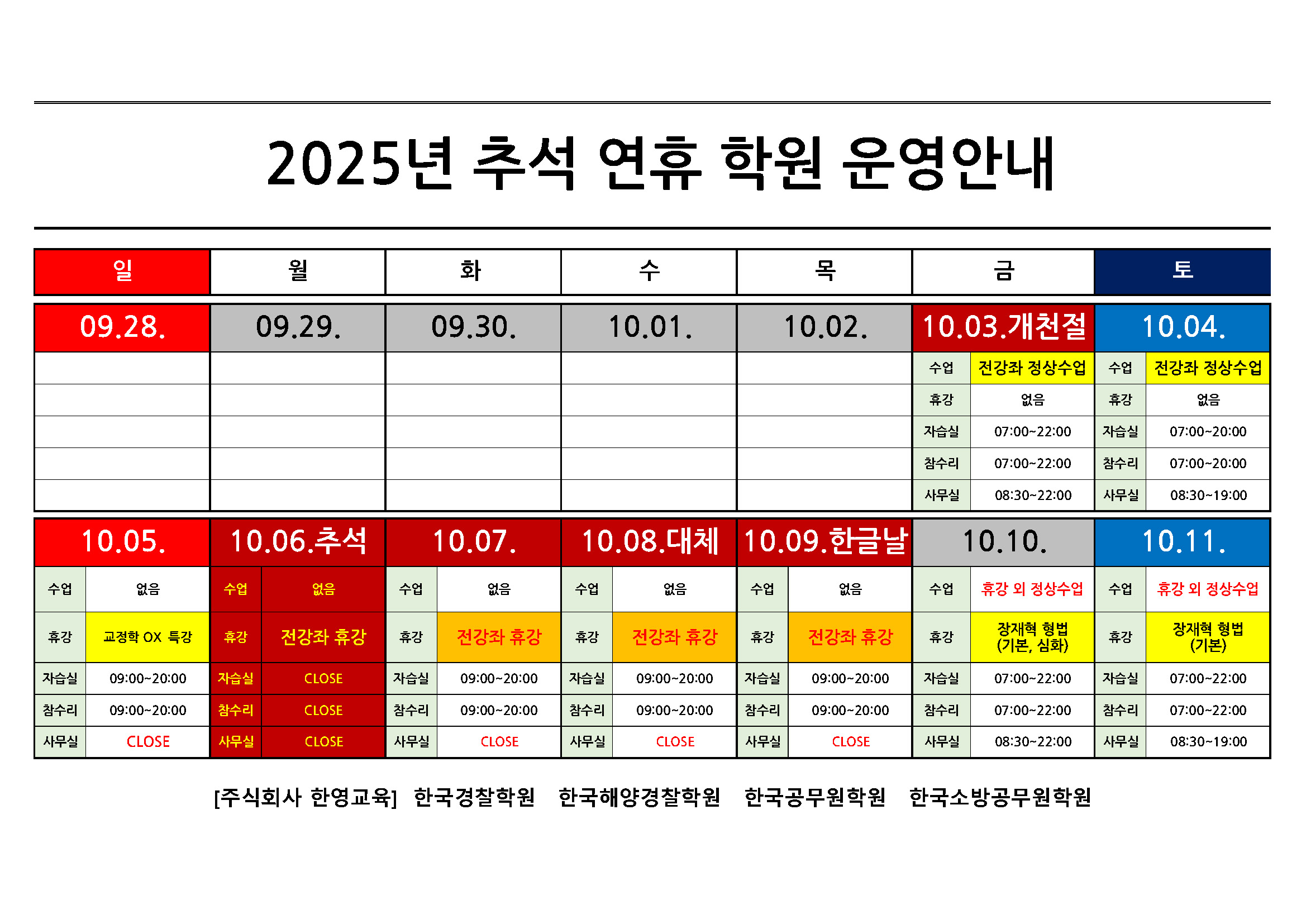 추석 연휴 학원 운영안내
