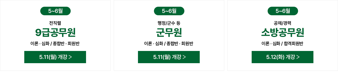 강좌안내 · [4월 개강] 지방직/군무원 대비 실전문제풀이 4/13(월) 개강 26.03.20 · [3-4월] 공무원/소방공무원/군무원 과목별 심화단과 26.02.06 · [3-4월] 군무원 신규반 강좌안내 26.02.06 · [3-4월] 소방공무원 신규반 강좌안내 26.02.06 · [3-4월] 9급공무원 신규반 강좌안내 26.02.06 · [3-4월] 국가직 대비 실전문제풀이 3/9(월) 개강 26.02.06 · [교정직] 1월 교정직 단독반 강좌안내 25.12.19 공지사항 · [5월 무료특강] 합격을 결정하는 행정법 THE심화 무료특강 26.04.02 · 2026 부산교통공사 시험대비 특별 합격반 개강! (3월 둘째주 예정) 26.01.29 · 3/9(월) 행정학 예상문제풀이 보강 및 국어(논리추론) 수업시간 변경 공지 26.03.09 · 3/6(금) 공무원 합격설명회 + 영어 과목설명회 26.02.13 · 3/5(목) 교정직 단독 합격설명회 26.02.13 · 설 연휴 학원 운영 안내 26.02.09 · 1/5(화) 교정직 단독 합격설명회 25.12.15 시험정보 · [해병대 제2026-12호][공채/경채]2026년도 해군 일반군무원 채용시험 시행계획 공고 26.04.02 · [해군 제2026-6호][공채/경채]2026년도 해군 일반군무원 채용시험 시행계획 공고 26.04.02 · 2026년도 공군 주관 일반군무원 공개경쟁채용시험 시행계획 공고 26.04.02 · 2026년 육군 주관 일반군무원 공개경쟁채용 시험 시행계획 공고 26.04.02 · 2026년도 국방부 주관 일반군무원 채용시험 시행계획 공고 26.04.02 · 2026년도 제1회 부산광역시 지방공무원 임용시험 응시원서 접수 현황 26.03.31 · 2026년도 국가공무원 9급 공채 필기시험 일시·장소 및 응시자 준수사항 공고 26.03.27 한국공무원학원의 체계적인 커리큘럼 STEP.1기본이론상시개강 [접수중] STEP.1기본이론기본개념 및 전체적인이해와 체계를 세우는이론 강좌 STEP.2 심화이론STEP.3 테마특강수시개강 [접수중] STEP.2 심화이론STEP.3 테마특강심화이론을 통한실력 업그레이드과정 기출문제풀이 기출문제풀이유형분석을 통해상태점검 및약점 보완 예상문제풀이 예상문제풀이응용 문제 확인!고득점을 위한필수 과정 실전모의고사[접수중] 실전모의고사시간 배분 연습 및실전 감각익히기 Final 화룡점정연속모의고사 Final 화룡점정연속모의고사최종 마무리핵심 정리단계 예약하기 부산은행113-2008-3725-00(예금주:주식회사 한영교육 정태일) 자세히보기 한국공무원학원 강사진 +교수진 전체보기