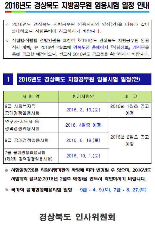 2016년도 경상북도 지방공무원 임용시험 일정(안) 안내