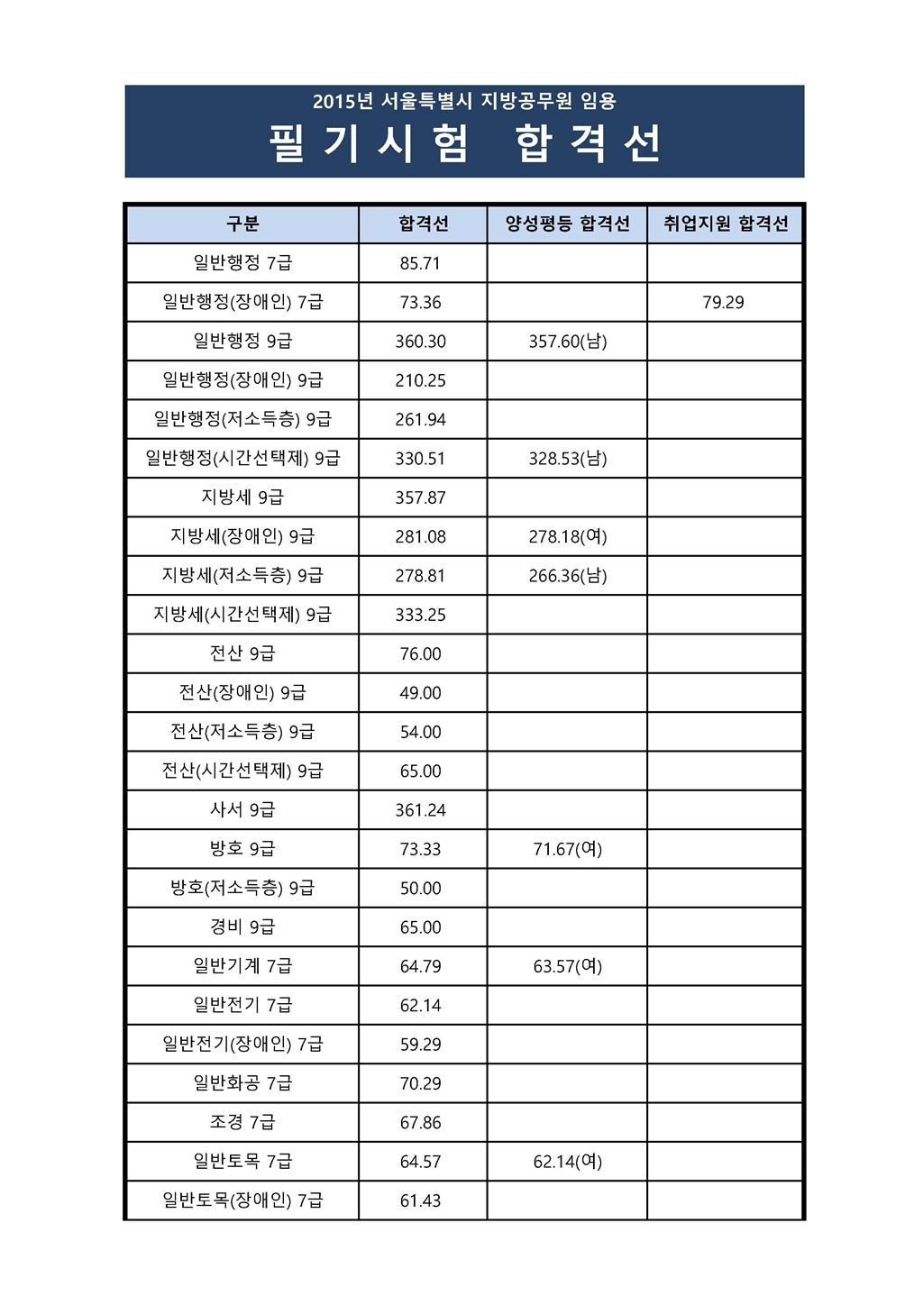 2015년도 서울특별시 지방공무원 임용 필기시험 합격선