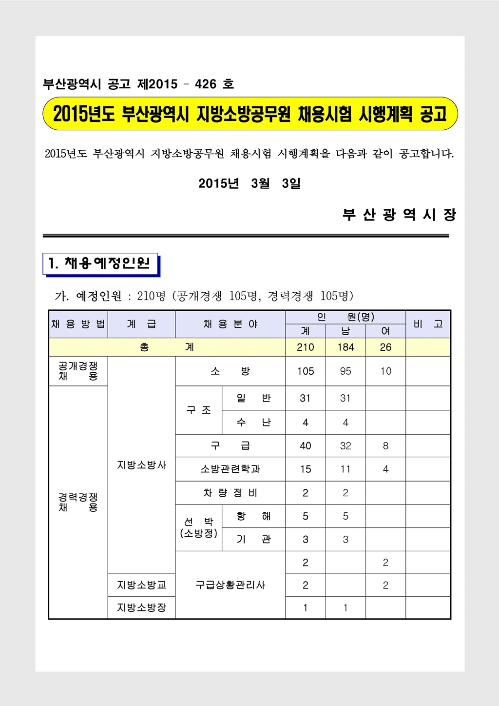 2015 부산시 지방소방공무원 채용시험 시행계획 공고(~3.20)