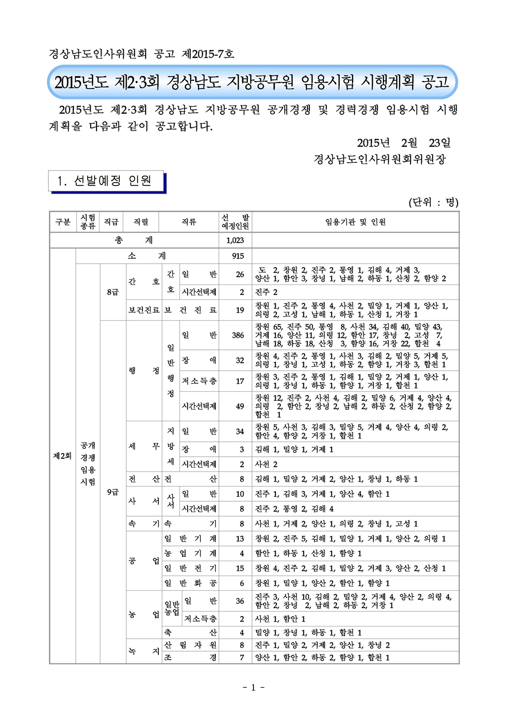 2015 제2·3회 경남 지방공무원 임용시험 시행계획 공고