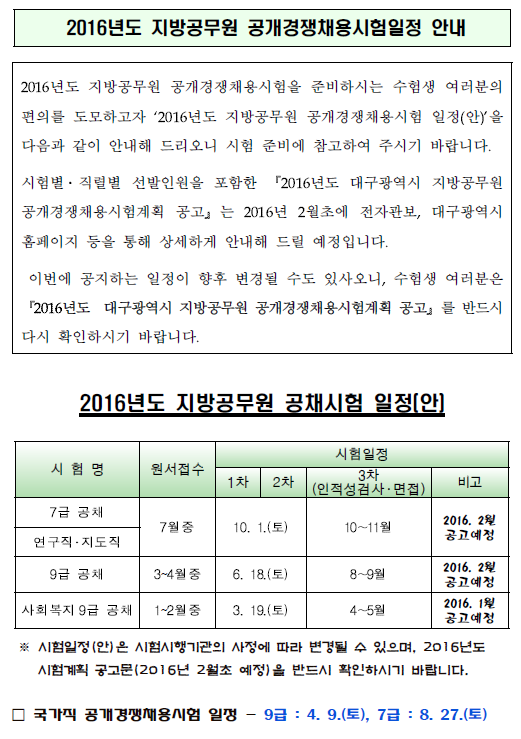 2016년도 대구지방공무원 공개경쟁채용시험일정 안내