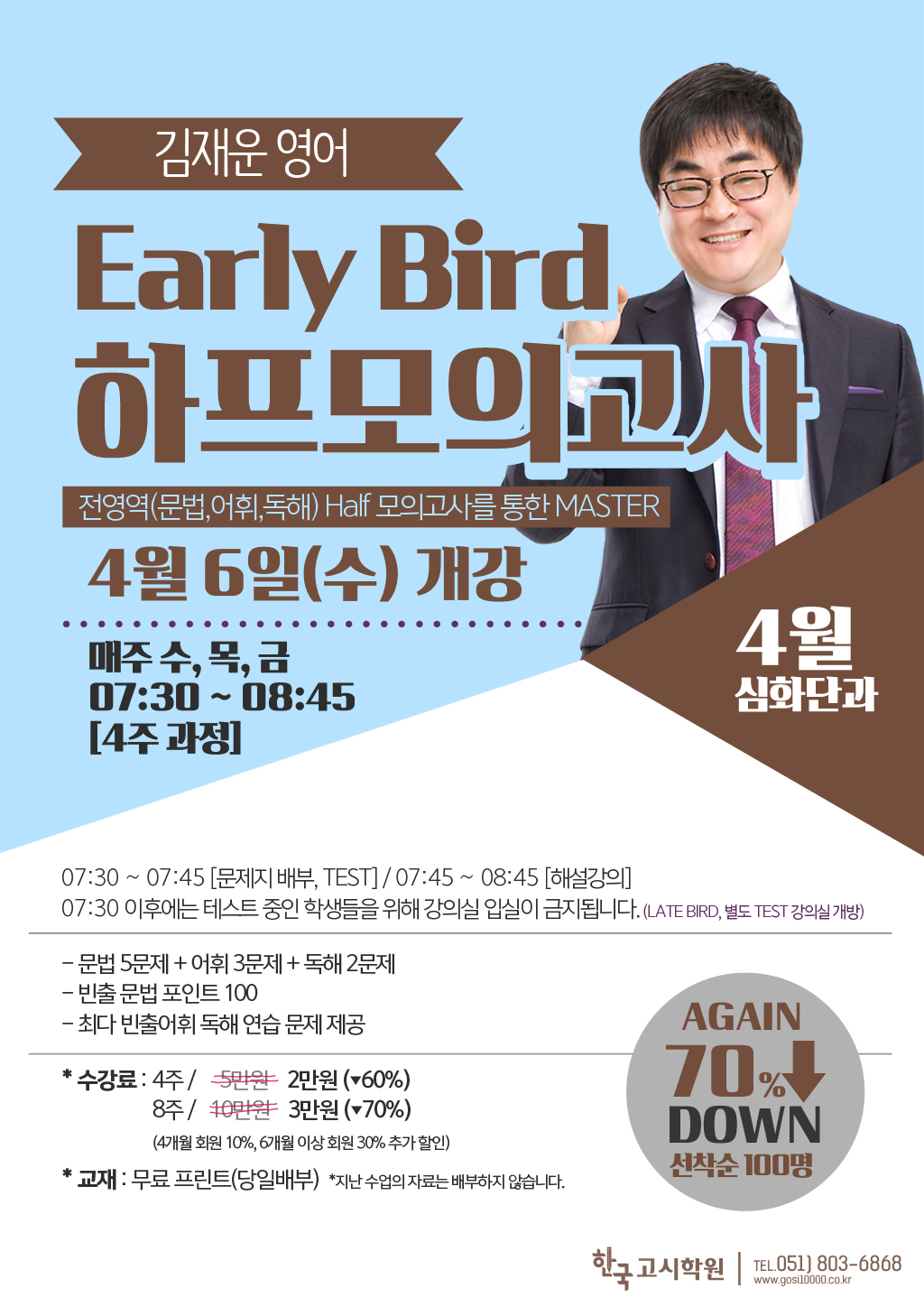 [4월 개강] 김재운 영어 얼리버드(하프모의고사) 개강 * 최대70%할인 이벤트