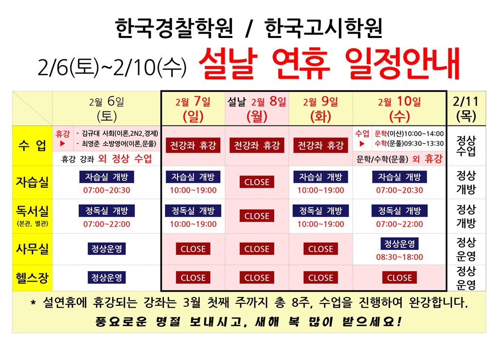 [설연휴 학원 운영일정] 2/6(토)~2/10(수) 수업, 자습실, 정독실, 사무실 [수정]