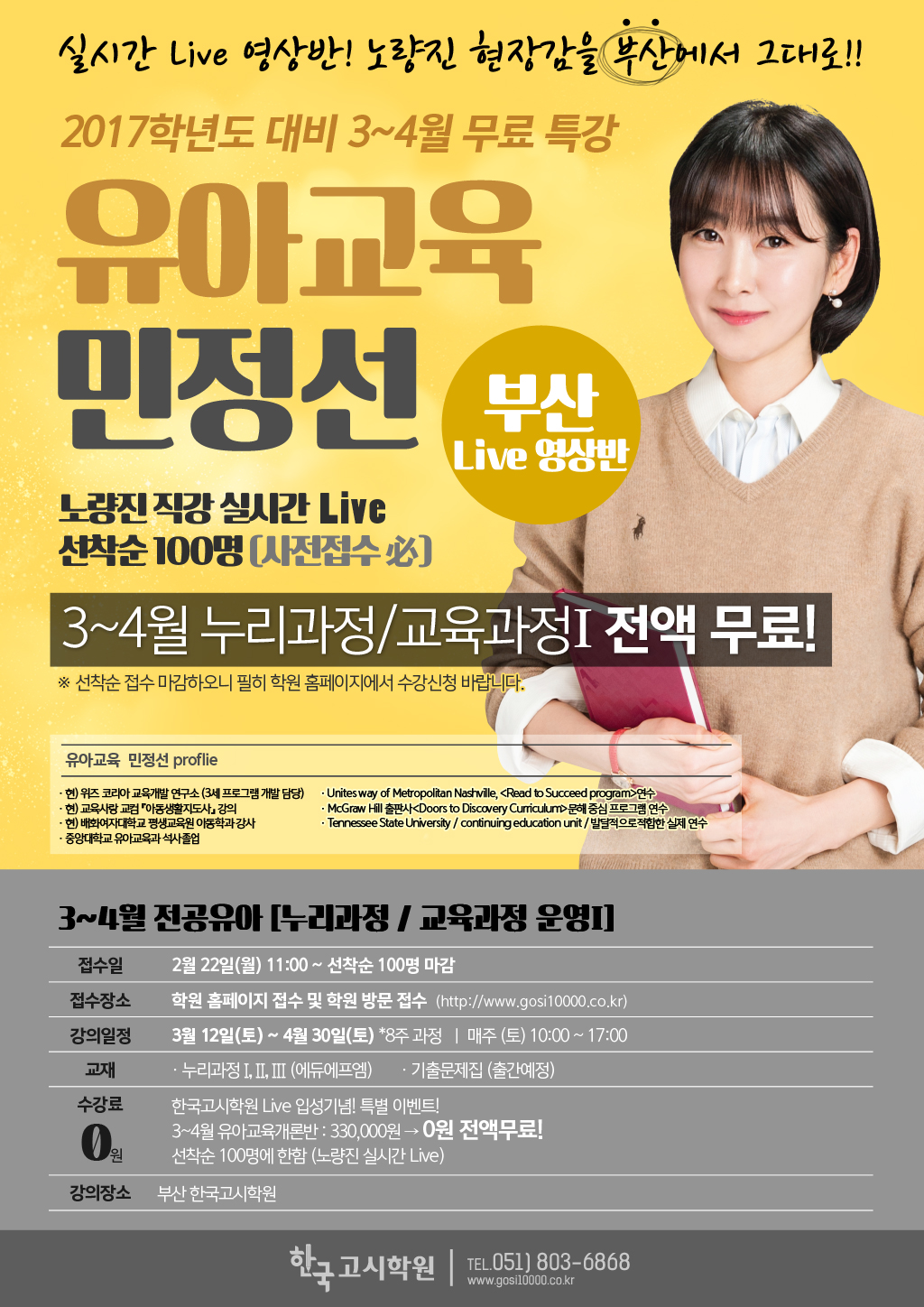 [3~4월 유아임용] 3~4월 민정선 유아교육 ★부산LIVE 무료특강, 선착순 100명