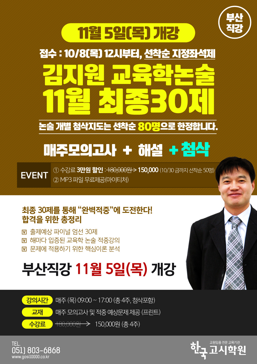 [개강] 11월 김지원 교육학논술 "최종 30제" 수강료 3만원 할인 이벤트