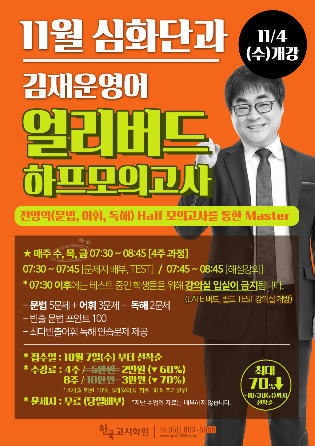 [개강] 11월 김재운 영어 얼리버드 (하프모의고사) 개강 * 최대70%할인 이벤트