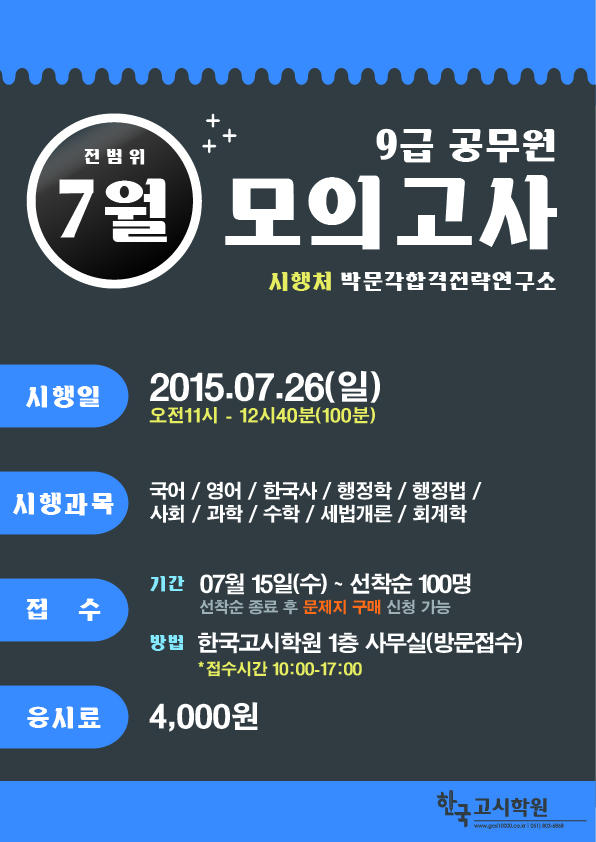 * 한국고시학원에서 07월 26일(일) 전국모의고사(시행처 박문각 합격연구소)를 시행합니다.