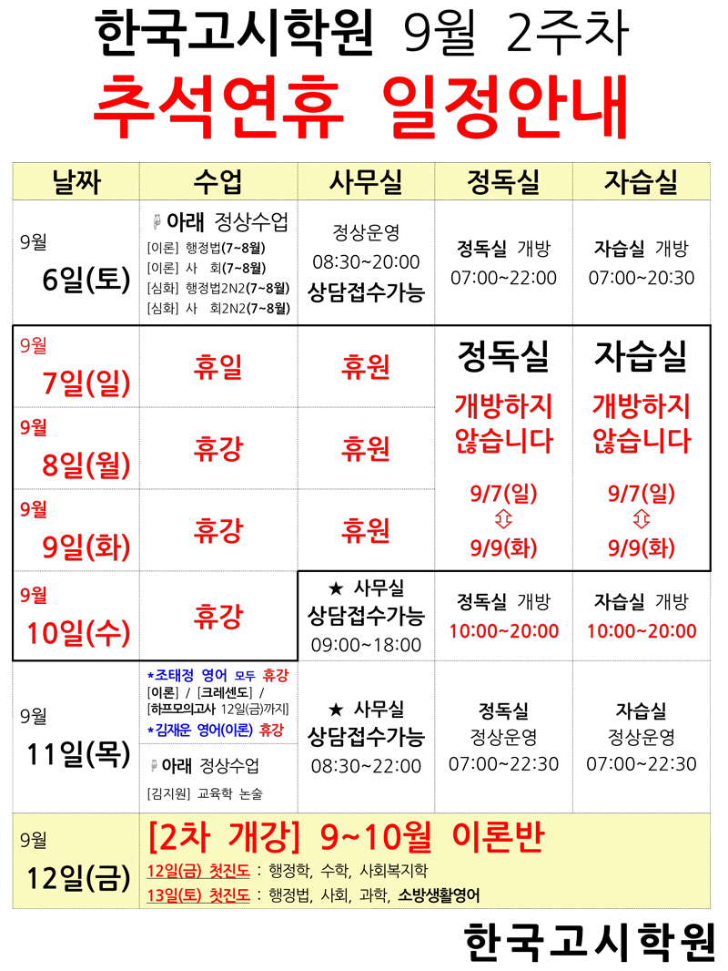 [추석연휴 수업 등 일정 공지]