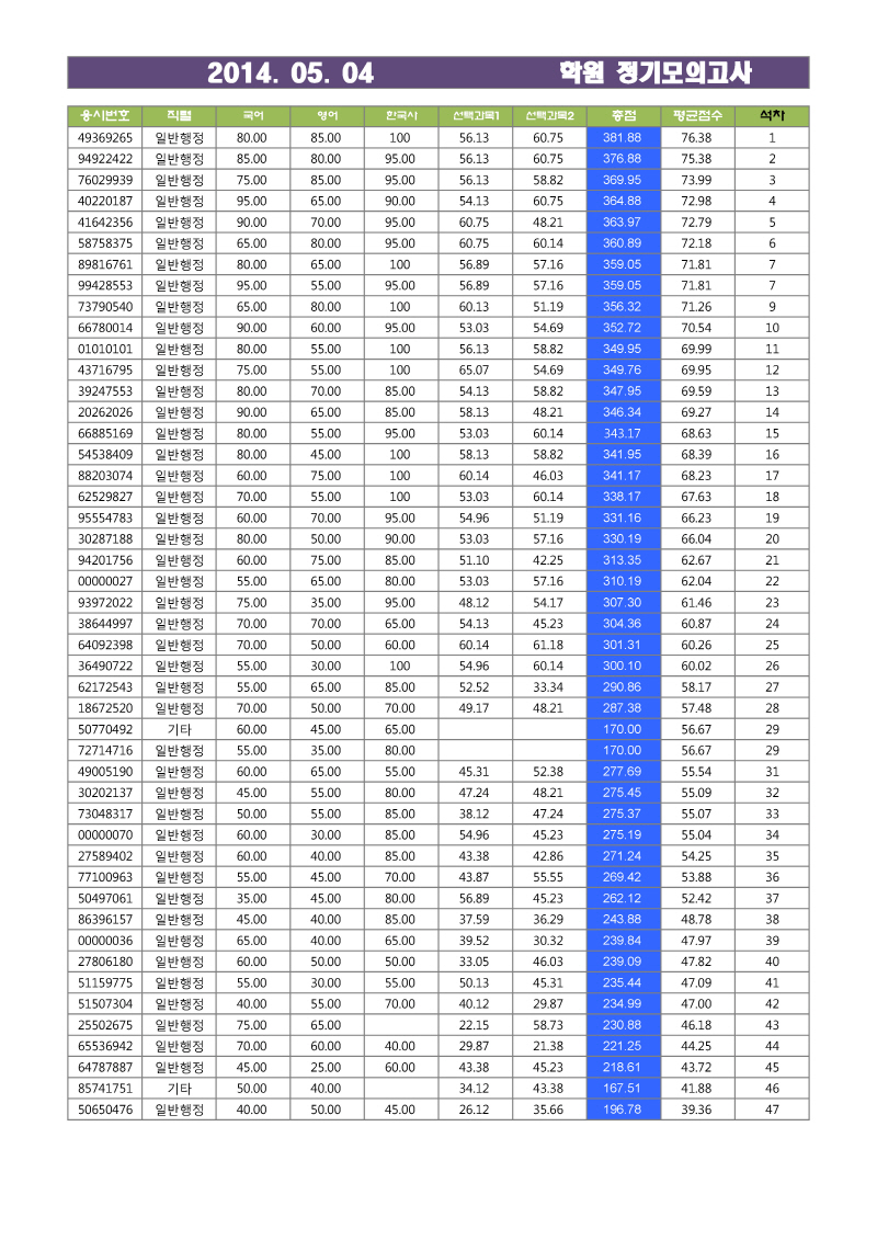 5/4(일) 정기모의고사 성적 게시 안내