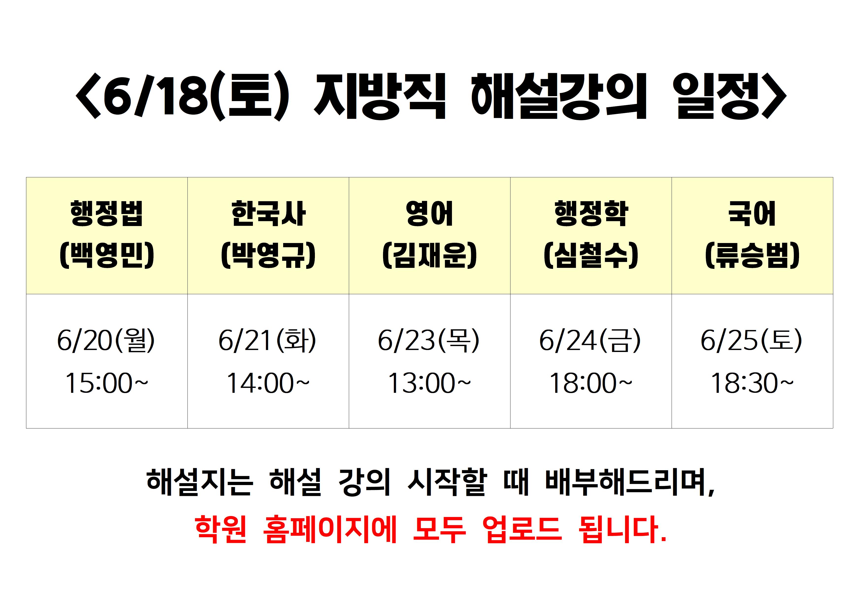 ◆6/18(토)시행 지방직 9급공무원 해설강의 일정◆