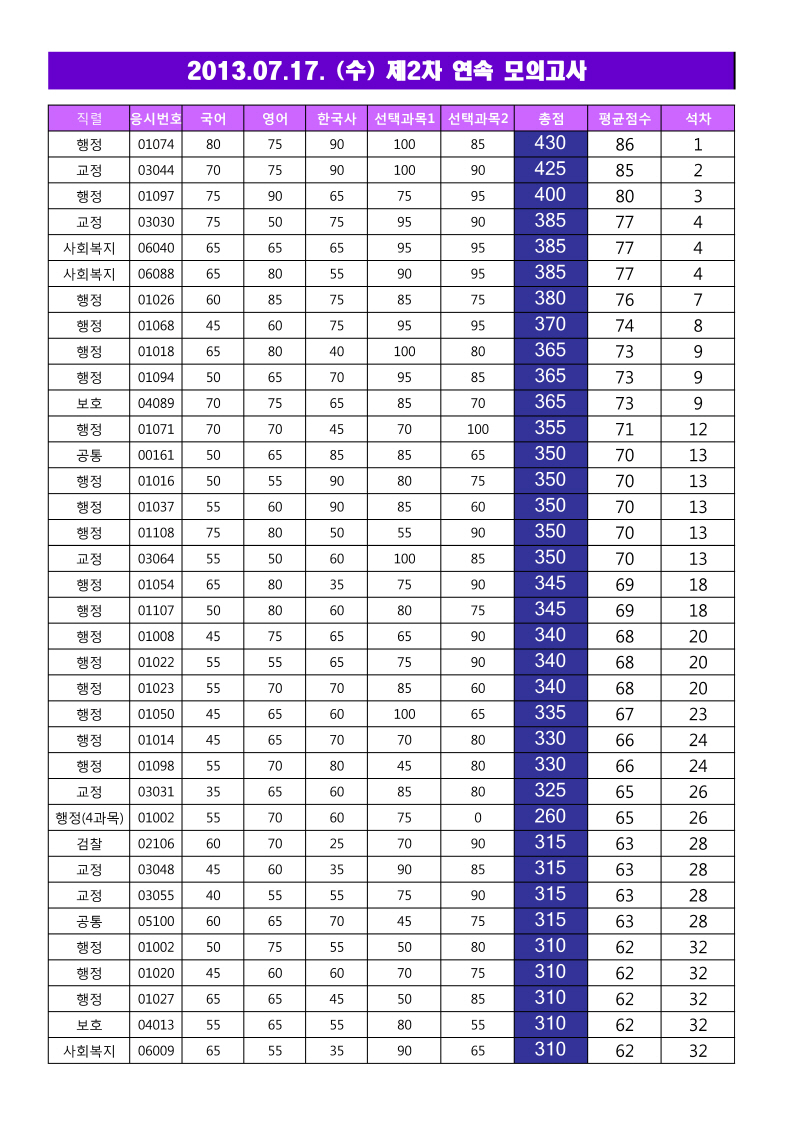 제2차 연속 모의고사 성적표 게시 및 오류 정정- 2013.07.17. (수)